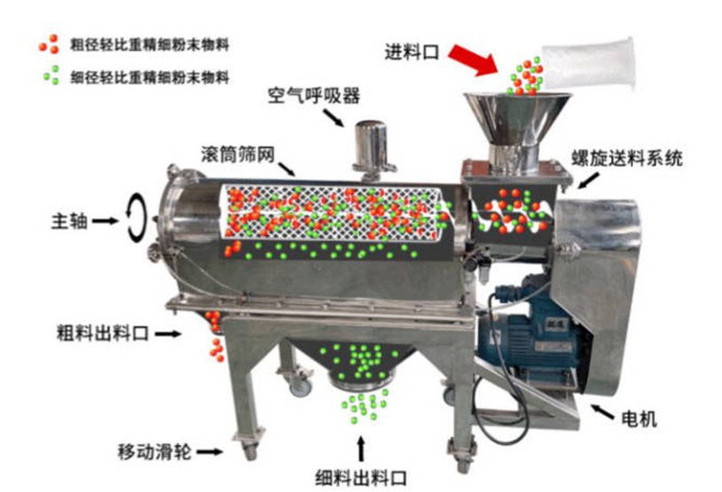 氣流篩分機(jī):主體為立式密閉圓筒篩箱,中心裝有高速旋轉(zhuǎn)的轉(zhuǎn)子(風(fēng)輪)。篩網(wǎng)呈圓筒狀嵌于箱體內(nèi)壁。工作時(shí),風(fēng)機(jī)產(chǎn)生的氣流攜帶物料,在轉(zhuǎn)子作用下使細(xì)粉穿透篩網(wǎng),粗粉被分離。通常配有旋風(fēng)分離器實(shí)現(xiàn)氣固分離。