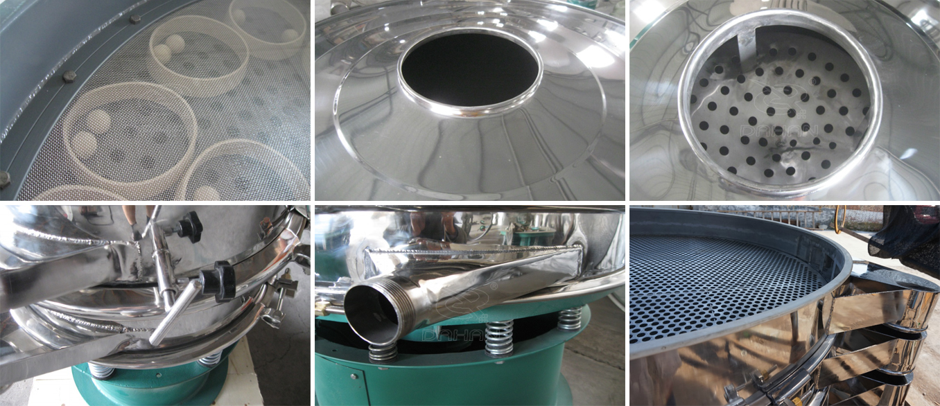 DH-1500型不銹鋼振動篩為直徑1500MM,一層兩個出料口,與物料接觸部分為304不銹鋼材質(zhì),底座部分為碳鋼材質(zhì)。